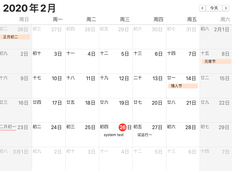 BEGIN:VCALENDAR # 日历段开始 VERSION:2.0 # 版本说明 PRODID:ACMClass Calendar Beta # 生成器版本 BEGIN:VEVENT # 事件段开始 DTSTART:20200226T133000 # 开始时间,用T分割。结尾无字母表示默认本地时间 DTEND:20200226T140000 # 结束时间,用T分割。结尾无字母表示默认本地时间 SUMMARY:system test # 事件综述 DESCRIPTION:This is a system test. # 事件详情 END:VEVENT # 事件段结尾 END:VCALENDAR # 日历段结尾